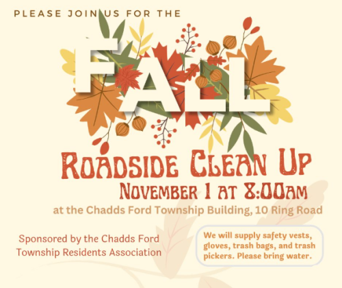 Join your neighbors in helping keep Chadds Ford clean. The Residents Association will provide safety vests, gloves, trash bags, and pickers. Please bring water.