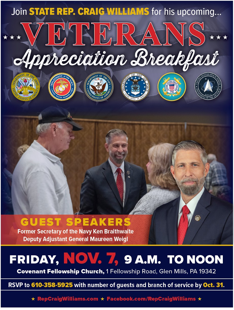 My annual Veterans Appreciation Breakfast is Friday, November 7, from 9 a.m. to noon at Covenant Fellowship Church at 1 Fellowship Dr, Glen Mills. Former Secretary of the Navy Kenneth Braithwaite and Pennsylvania Deputy Adjutant General Maureen Weigl will be this year’s special guests.
