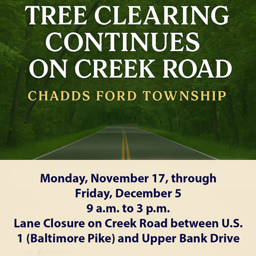 Crews will work from Monday, November 17, through Friday, December 5. They will close a lane on Creek Road between U.S. 1 (Baltimore Pike) and Upper Bank Drive on weekdays from 9 a.m. to 3 p.m.