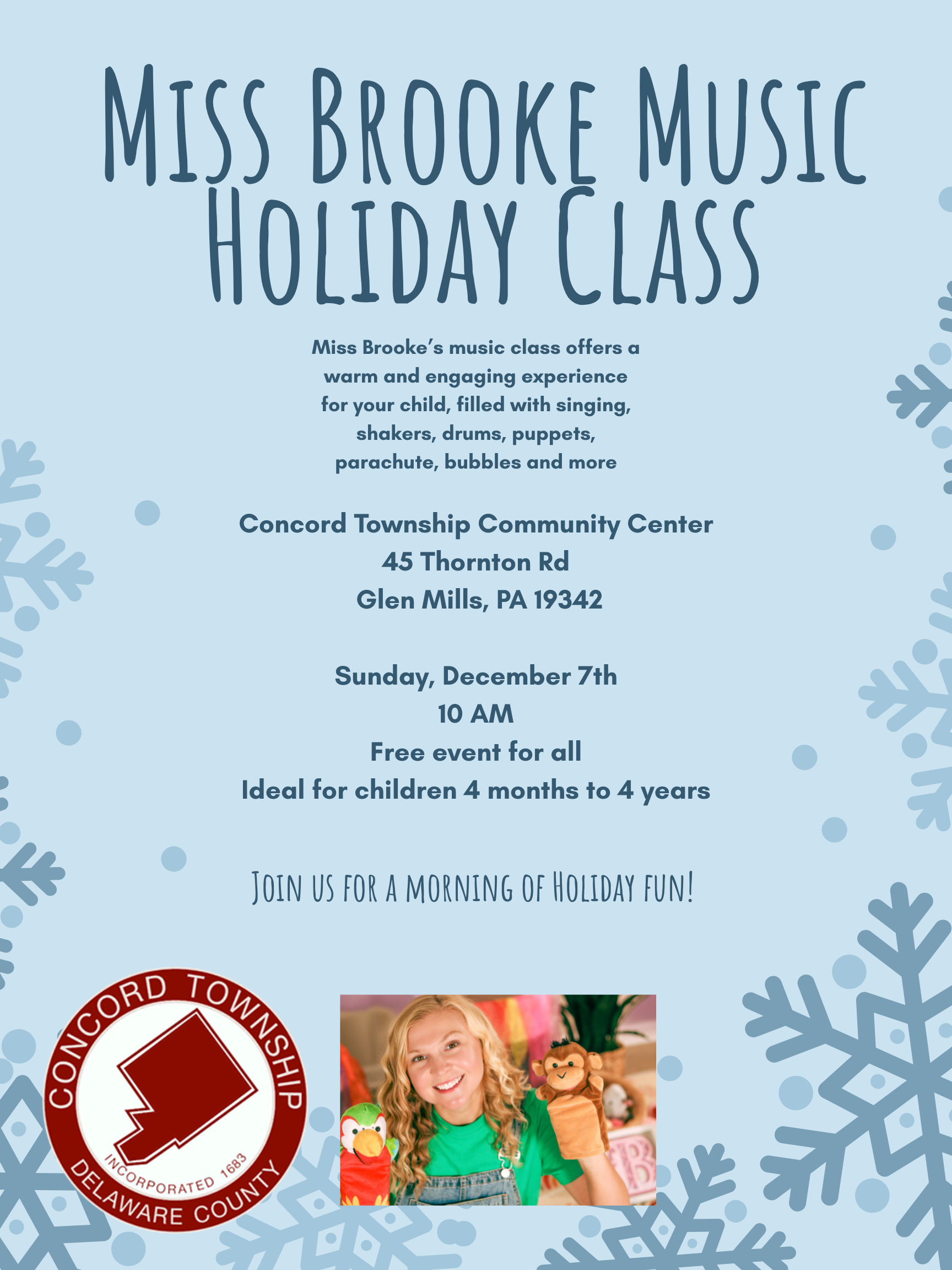 Miss Brooke will offer a free holiday music class on Sunday, December 7, at 10 a.m. at the Concord Township Community Center, 45 Thornton Road, Glen Mills. The class is designed for children ages four months to four years. Families may enjoy singing, shakers, drums, puppets, the parachute, bubbles, and other activities.