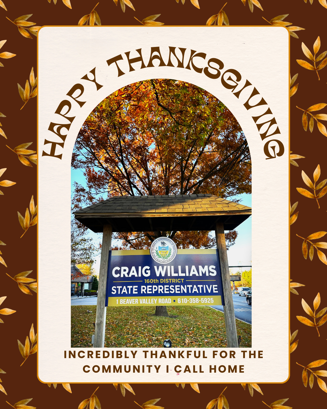 Thanksgiving reminds us to slow down and give thanks for the people who shape our lives. As a Marine Corps veteran and as your state representative, I remain grateful for our neighbors across Chester and Delaware Counties who give their time, energy, and kindness to support one another. Strong communities do not happen by accident. They grow because people choose service over self and look after the people around them.