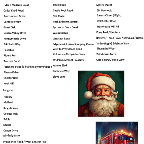 The Edgmont Fire Department will be escorting Santa around parts of town on Saturday, December 20, starting at 10 a.m. Santa’s route is available here.