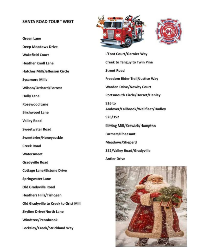 The Concordville Fire Company will bring Santa to Concord and Chadds Ford on Saturday, December 20 from 1 – 4 p.m. Please keep an eye on the Concordville Fire Company’s Facebook page for updates. The Fire Company will post a link to their Santa Tracker on the day of the tour.