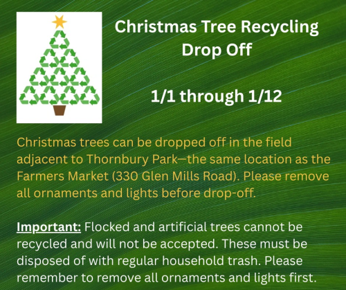 Christmas tree drop offs in Thornbury Township started on Thursday. Trees can be dropped off in the field adjacent to Thornbury Park (330 Glen Mills Road). All ornaments and lights must be removed before dropping off your tree.