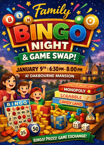 Westtown Township residents are invited to join their neighbors for an evening of bingo and board game swapping on Friday, Jan. 9, from 6:30 p.m. to 8 p.m. The event will take place at the Oakbourne Mansion, 1014 South Concord Road, West Chester.