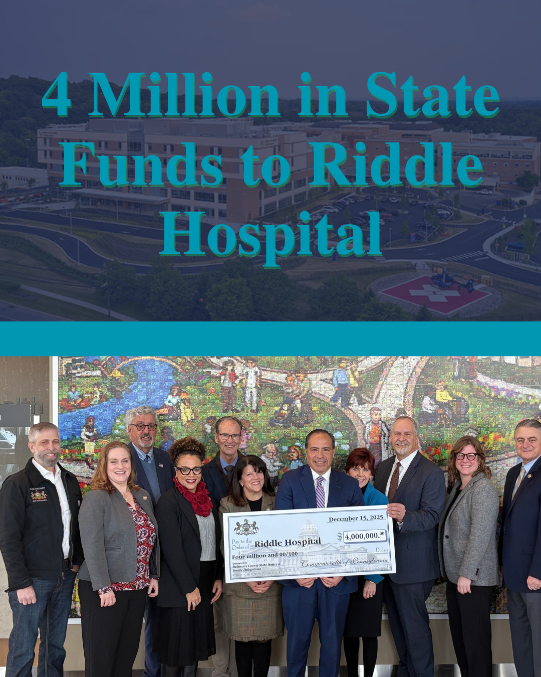 I joined members of the Delaware County legislative delegation at Riddle Hospital for the presentation of $4 million to Main Line Health as they work to fill the gap of closed hospitals in our county. The Pennsylvania Legislature provided this funding through the state budget, and it will directly support our hospital operations and patient care in our region.