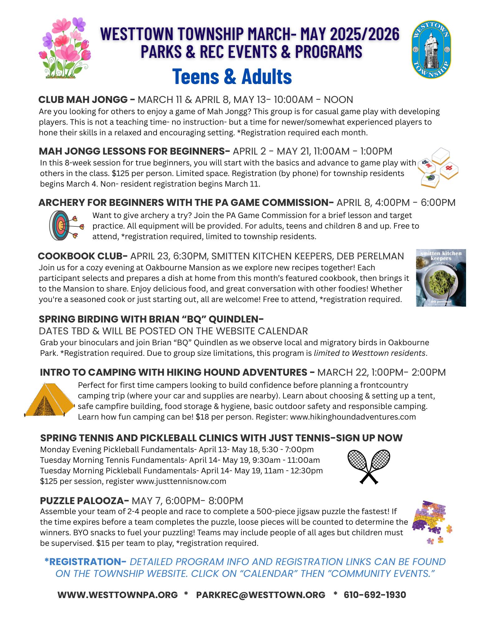 Westtown Township released their March-May Parks and Recreation events and programs schedule. There are events for the whole family as well as for just adults. This is a great opportunity to get out and meet neighbors as well get out with the family!