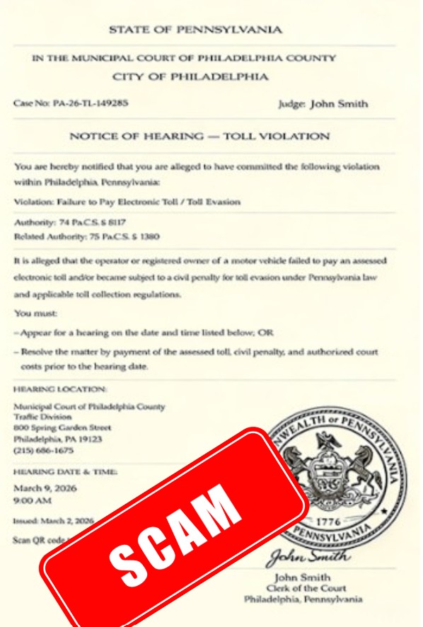 These messages falsely claim to come from the “Traffic Division of Philadelphia Municipal Court.” The texts typically state that the recipient owes unpaid tolls, fines and court costs and may include a fake QR code directing the recipient to submit payment.