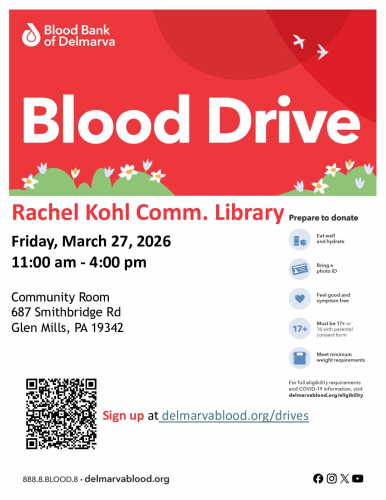 The Rachel Kohl Community Library will host a blood drive on Friday, March 27, from 11 a.m. to 4 p.m. The drive will take place in the library’s community room at 687 Smithbridge Road in Glen Mills.